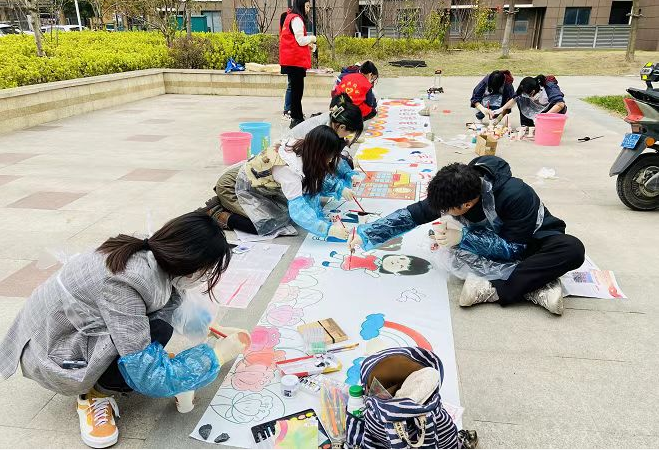 19日下午春日里阴沉的天气没有磨灭青年志愿者们的热情,“青春社区行,共画二十大”活动从绘画长卷开始。小公园里摆放着的白色长卷让人蠢蠢欲动,年轻的学子们看着印制精美的画卷都迫不及待的在长卷上大显身手。活动正式开始了,大家席地而坐挥笔泼墨,各自认领了一方“领土”,调色上色行云流水一气呵成。绘画现场吸引了众多居民驻足观赏,前来观看的孩子们也跃跃欲试,得到家长同意后也加入了绘画大军,趴在画布上,用自己纯朴的童心和稚嫩的小手,在长卷上尽情挥洒。水彩画五彩缤纷,大家充分发挥着想象力与创造力,一笔一划仔细描摹,聚精会神地画着自己心中的“党的二十大”。经过一下午的集体创作一幅10米长卷出现在了眼前。青年们用自己的想象力,勾勒出一幅栩栩如生的画面,让围观的居民赞叹不已。