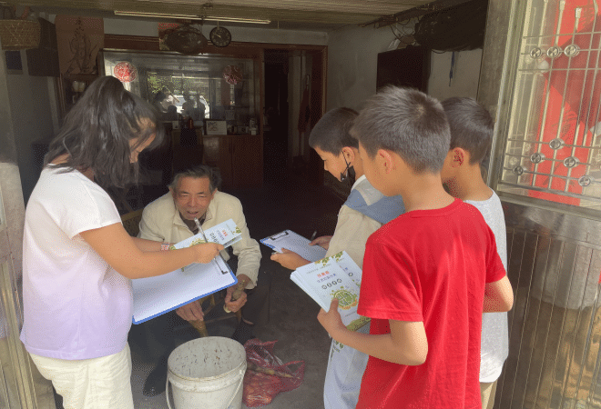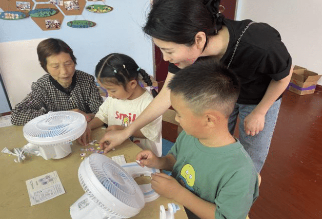 本次活动以破冰游戏“逢7必破”开始,青少年们可以彼此熟悉起来,让现场活动气氛变得更加活跃。志愿者引导青少年们回顾上次的活动内容从而进入到这个活动的主题,让青少年说一说他们了解的社区工作者,介绍社区工作者的重要作用、工作内容、精神品质,以及成为一个优秀社区工作者需要拥有的知识技能。介绍完社工的职业知识之后,就进入到沉浸式体验环节,社区工作者们对青少年们进行了简短的“岗前培训”,并说明工作内容、注意事项。社区为青少年们准备了垃圾分类、巡回检查社区服务岗位体验,青少年们可以根据自己对岗位的兴趣参加体验。在社工的引导下,化身小小社区工作者的孩子们使命感满满,非常积极地参与垃圾分类,向路过的居民发放宣传保护环境的重要性,有的还积极清理了路边的垃圾;接着小小工作者继续体验了楼道巡查,帮助社区工作者检查楼道灭火器以及楼道卫生状况清理小广告。体验结束后,针对青少年及孩子在体验中存在的一些疑惑点社区工作者进行解答。沉浸式的体验,不仅让青少年们对社区工作者有了基本认识,体验到社区工作者的工作内容,还进一步感受到社区工作者职业需要的责任感和奉献精神。最后在社工的引导下,青少年们给社区工作的叔叔阿姨制作DIY风扇,并写下了美好的祝福语送给了社区叔叔阿姨。