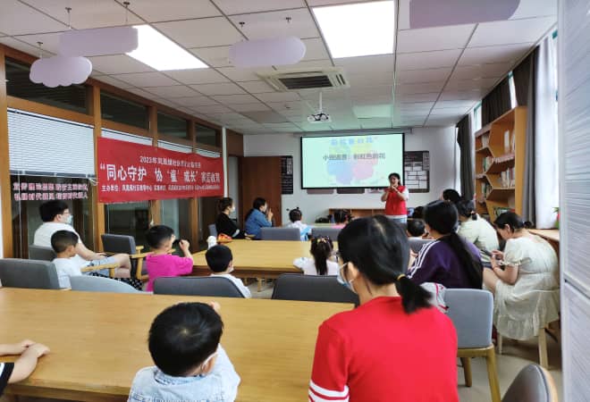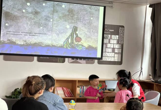 活动开始,教师志愿者以《花园种花》手指游戏为导入,让幼儿彼此熟悉起来,调动起了活动的兴趣。随后开展绘本阅读,教师志愿者以彩虹花的愿望“把自己破土而出的快乐分享给其他人”为线索,引导青少年观察绘本画面,猜测故事情节。绘本中不同角色之间的对话通过音频形式播放,让幼儿更易理解故事情节。当讲到彩虹花最后一片花瓣也被风吹走后,现场邀请两名青少年,扮演彩虹花和遇到困难需要帮助的小朋友,以此让青少年亲身体验帮助别人的快乐和学会感恩。活动最后邀请青少年和家长一起做一朵属于自己的彩虹花,增加了亲子之间的合作交流。