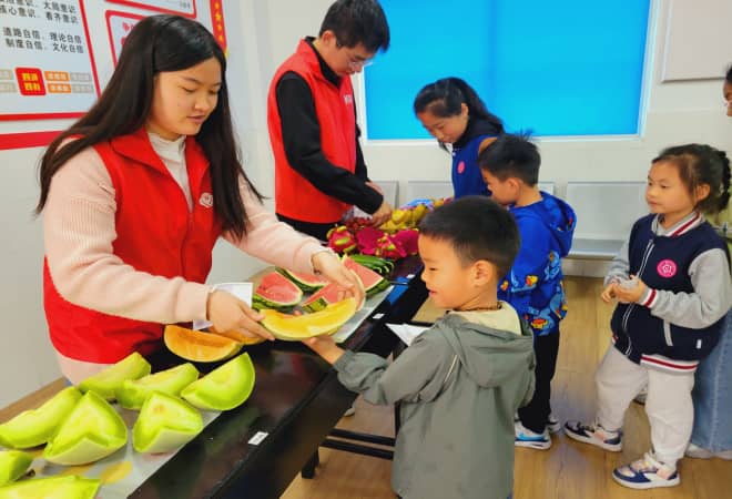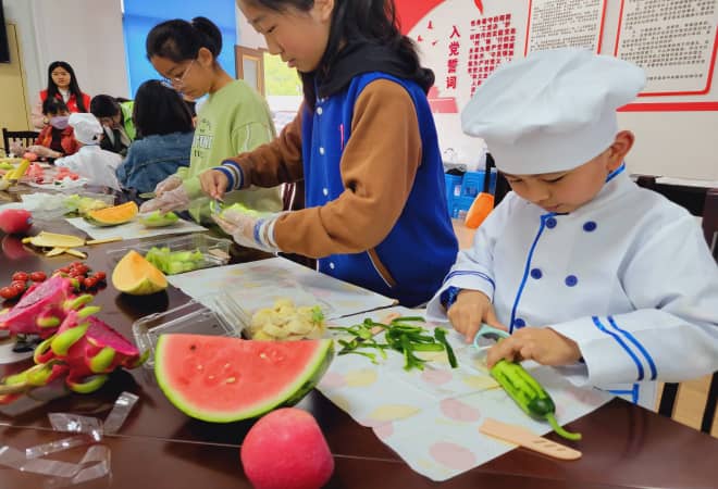 在“以劳促德”的教育环节中,青少年们用事先准备好的纸币模拟在水果店挑选购买水果,并用购买的水果制作创意水果拼盘。通过参与水果的挑选、购买和制作的过程,让孩子们对水果价格有了更多的了解,同时也在制作过程中体验了劳动与快乐。