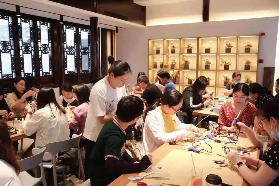 在菉葭巷的青春小站,开设有文化体验与阅读,青年大学志愿者正在这里担当起图书管理员的工作,而在边上的互动体验区,志愿者们也与邀请来的新兴青年一道,指导游客开展掐丝珐琅书签活动。