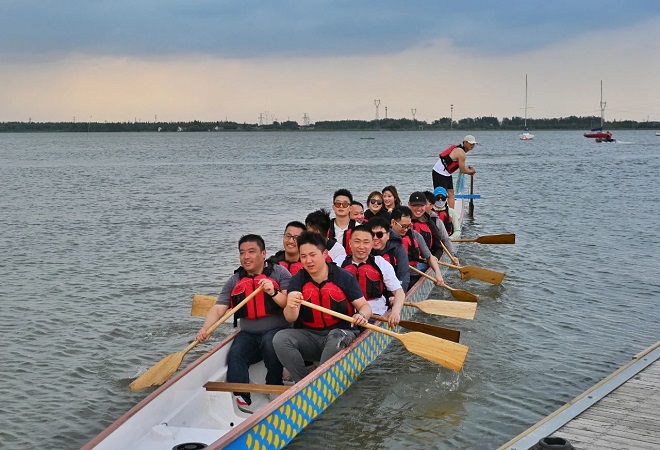 教练现场讲解水上安全注意事项及相关龙舟项目技巧 ,青年员工分成2个小队,穿好救生衣、拿好船桨,在各自的龙舟前摩拳擦掌。素拓活动寓教于乐、生动有趣,既是对脑力和身体的考验,更是对团队与个人的磨练。下午的素拓活动,在大家的欢乐气氛中圆满结束。
