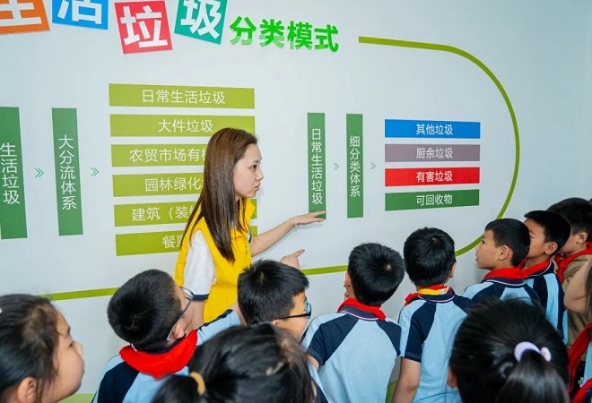 青年志愿者利用“沉浸式体验”的形式,带领学生们参观垃圾分类知识宣教展区、中央控制室,通过了解垃圾车实时行进线路、卸料作业、垃圾压缩作业和大件及园林绿化垃圾破碎、分选作业全过程,学生们更直观地了解到目前垃圾分类处理的现状,亲身感受垃圾分类的重要意义。