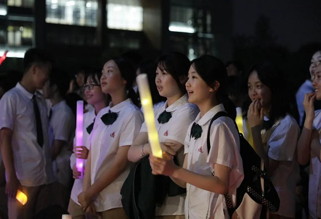 在科外,同学们的才华能够尽情展示。舞台之上,聚光灯下,师生同台,真情演绎,时而轻歌曼舞,曲声悠扬,时而纵情歌唱,热情四溢,学子们沉浸在电影经典情境中,把曾经的热爱与赞美传递,汇聚成浩瀚夜空中闪耀的点点星光。在这个时空里,科外真情随着音乐、伴着荧光恣意流淌。弟弟妹妹在台下翘首以盼的小脸,哥哥姐姐为小朋友们呐喊的热情,老师和家长们的欢欣与鼓舞,都是舞台演出的靓丽背景,共同的记忆与回忆,情感的交流与互动,让音乐会高潮迭起,无与伦比。